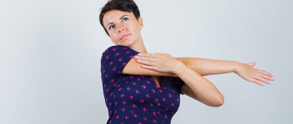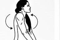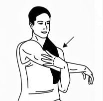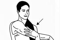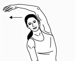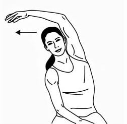Com os pés firmes no chão, leve um braço à frente do corpo e puxe-o para o lado com a ajuda da outra mão.